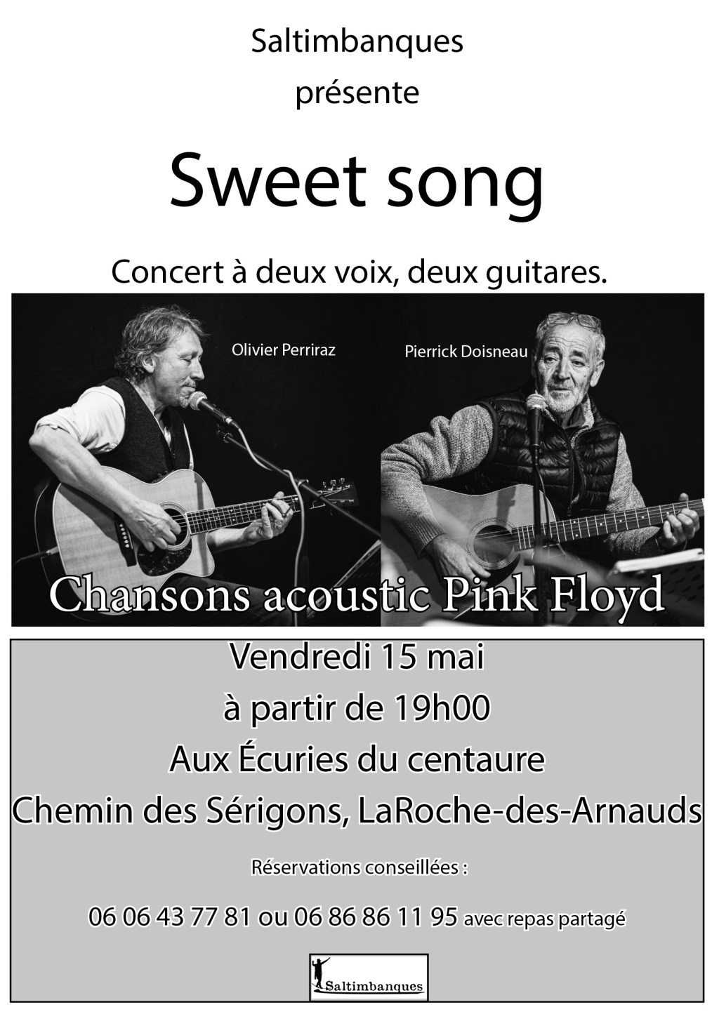 Pierrick Doisneau et Olivier Perriraz seront heureux de vous accueillir pour cette nouvelle soirée musicale le 15 mai prochain à partir de 19h00, au cœur de la forêt de Sérigons à la Roche-des-Arnauds, dans les écurie du centre Equestre le Centaure. Chacun apporte de quoi manger à partager et nous offrons les boissons. La participation est libre.